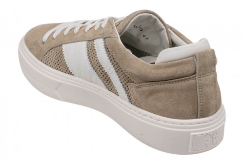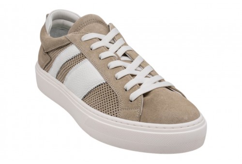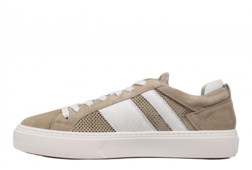 FABI SNEAKER FU1470 PIERRE HAVANA/BIANCO. La sneaker Pierre slip-on di Fabi, realizzata in pregiato camoscio con tomaia traforata, unisce eleganza e versatilità. Le strisce laterali in pelle aggiungono un contrasto distintivo, mentre la suola in gomma dal profilo alto garantisce comfort e flessibilità.
