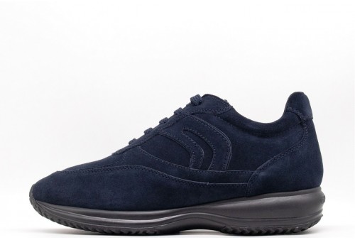 GEOX Happy uomo. Sneaker uomo dall'attitudine contemporanea, che offre leggerezza e traspirabilità. Realizzata in morbido scamosciato, ha uno stile casual raffinato perfetto per i look cittadini ed è incredibilmente versatile in questa variante blu navy. Dotata di un'intersuola più alta che migliora il livello di ammortizzazione, Happy arricchisce ogni outfit senza scordare il comfort.