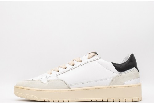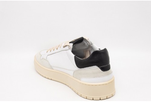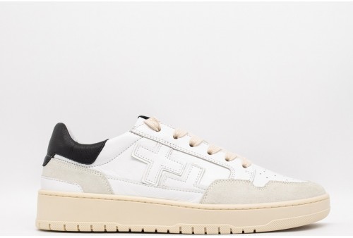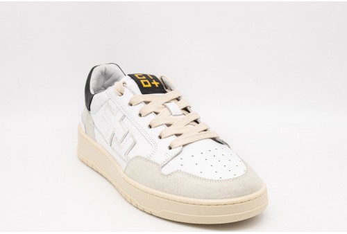 GIO + Sneakers Leonard. Sneakers GIO+ in pelle di vitello di colore bianco con riporti in pelle nera e camoscio bianco. Caratterizzata dal + + sulla parte esterna, targhetta sulla linguetta con il logo in grigio, lacci piatti in cotone beige.
