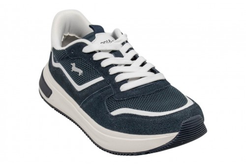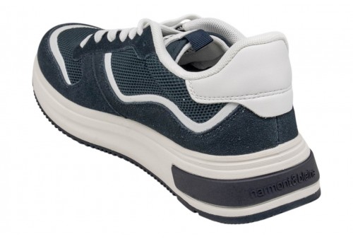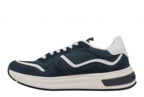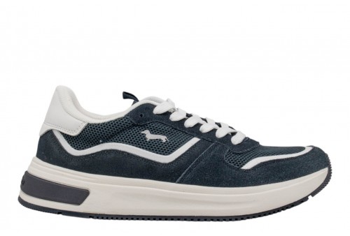 HARMONT BLAINE EFM261.050.BM0.A6 BLU. Sneaker in mix di suede e tessuto tecnico con applicazioni termo-saldate in gomma. Patch posteriore in pelle di vitello a contrasto con doppia cucitura. Logo tonale in gomma ad alta frequenza sul lato. Footbed tecnico in lycra e schiuma ergonomica. Suola con battistrada in gomma, intersuola in phylon e spoiler colorato con logo script.