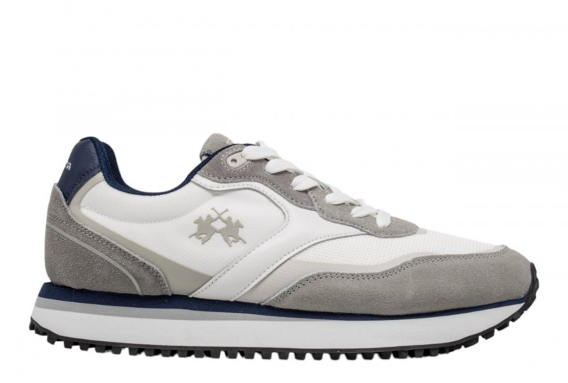 LA MARTINA LFM261.060.A60.BZ GRIGIO/BIANCO. Sneaker da uomo in mix di vitello, camoscio e tessuto con impunture artigianali a vista. Logo laterale iconico e scritta La Martina sul tallone in pelle. Suola bicolore con battistrada in gomma per stabilità e comfort quotidiano.