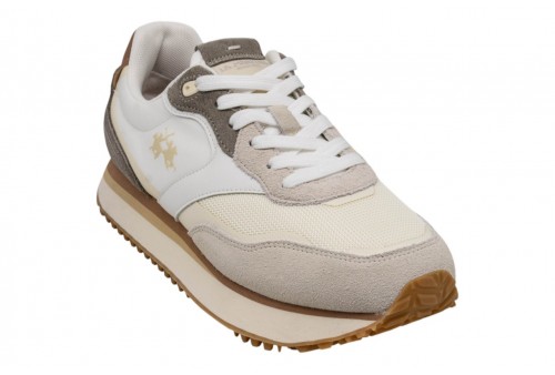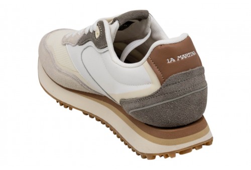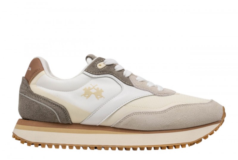 LA MARTINA LFM261.060.A60.E9 PANNA/OFF WHITE. Sneaker da uomo in mix di vitello, camoscio e tessuto con impunture artigianali a vista. Logo laterale iconico e scritta La Martina sul tallone in pelle. Suola bicolore con battistrada in gomma per stabilità e comfort quotidiano.