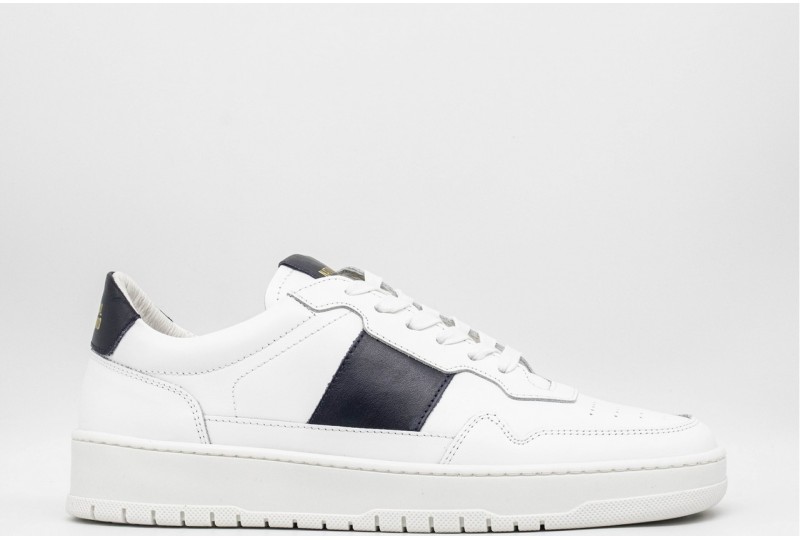 NATIONAL STANDARD EDITION 6 COGNAC BAND. Scarpe da ginnastica basse realizzate in nappa bianca, certificata LWG, pannelli in pelle scamosciata sabbia, certificata LWG, fascia cognac e tallone in nappa, certificata LWG, inguetta e linguetta sul tallone con marchio dorato, linguetta e caviglia imbottite. Fodera in pelle naturale bianca e rete organica, lacci in cotone cerato in tono.