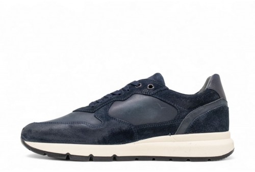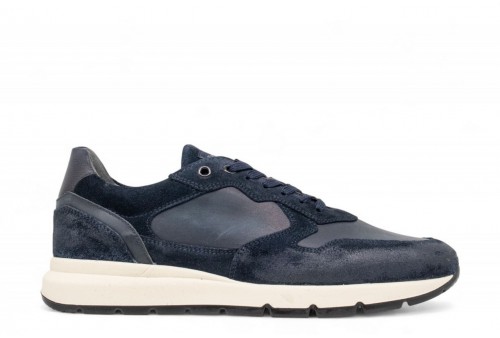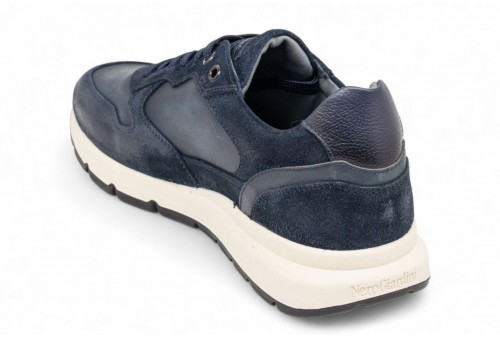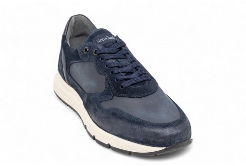 NeroGiardini Sneakers Uomo Camoscio e Pelle. Sneaker realizzata in pelle con inserti in camoscio sulle tonalità del blu. Linguetta con label logata. La soletta in poliuretano DryGo!®, oltre alle capacità di assorbimento del sudore e di asciugatura rapida, che mantengono il piede asciutto in qualsiasi condizione climatica, offre anche l'innovativa funzione Memory ad elevato assorbimento degli urti, che si modella delicatamente al piede garantendo comfort e benessere. COLORE: INCA