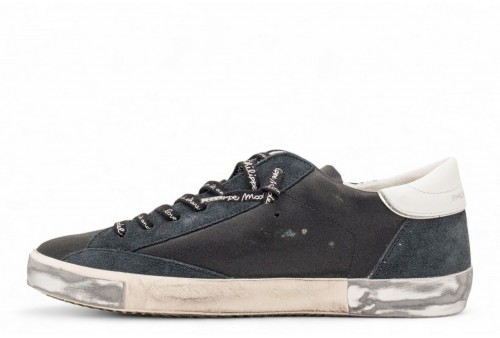 PHILIPPE MODEL SNEAKER PRSX LAMINE NOIR ARGENT.Minimalismo cromatico in bianco e nero per questa intramontabile versione della sneaker Prsx: le forme si ispirano ai modelli street anni '80, rivisitati in chiave contemporanea e fashion. La tomaia in vitello e suede è completata da topponcino a contrasto e bordi a specchio, con finitura used per un look originale. La fasciatura laterale asimmetrica è realizzata artigianalmente, con spazzolature per un effetto vissuto.