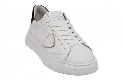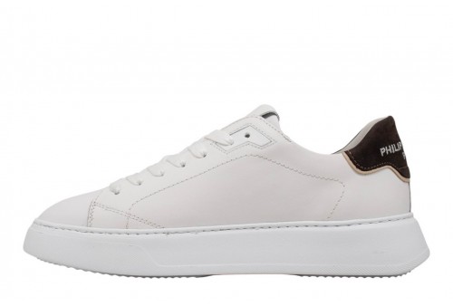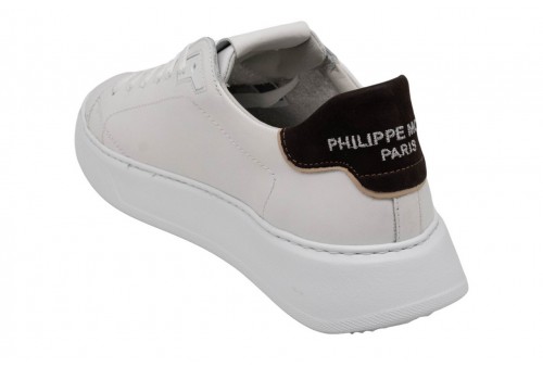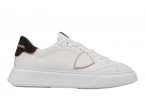 PHILIPPE MODEL SNEAKER TEMPLE LOW BLANC BRUN. Realizzata in morbido vitello con spoiler marrone, è completata dall'iconico scudetto laterale e dalla suola bold in gomma ultra leggera, con finiture artigianali.