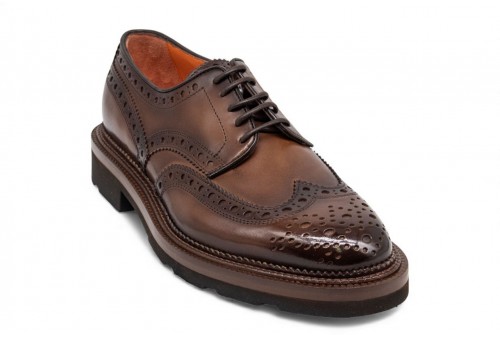 SANTONI Stringata Derby brogue in pelle. La reinterpretazione moderna dell'icona. Questa stringata Derby unisce patrimonio storico Santoni e gusto contemporaneo perché è realizzata in pelle pregiata con il classico motivo brogue. L'elemento speciale è la forma strutturata ma leggera con il fondo multistrato composto dal guardolo in pelle e dal battistrada in gomma a rilievo.