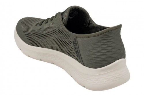 Skechers uomo Slip-ins: GO WALK Flex - Hands Up 216324/OLBK. Segui il tuo ritmo con la flessibilità e il comfort di Skechers Hands Free Slip-ins® GO WALK Flex™ - Hands Up. Con il nostro design Heel Pillow™, questo modello dotato di lacci elasticizzati presenta una tomaia in mesh con dettagli tecnici termosaldati, una soletta Skechers Air-Cooled Memory Foam™ e un’intersuola ammortizzata ULTRA GO® leggera.